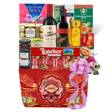 Yellow Tail Red Wine 750ml, Finca Camino Red Wine 750ml, Tradition Abalone 425g, Ferrero Rocher T16, Brown & Halley Almond Roca 140g, Loacker Napolitaner 225g, Belgian Chocolate 65g, St Dalfour France Strawberry Fruit Spread 284g, Langnese Pure Honey 375g, Starbucks Cappuccino 72g, McCoy Green Tea Mint 36g, Butter Cookies 70g, Nonya Kuih Bangkit 60g & Packaging.