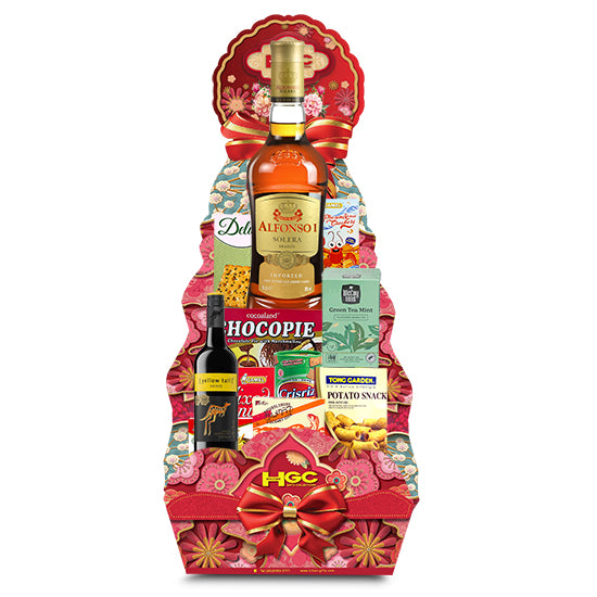 Alfonso Brandy 70cl, Yellow Tail Australia Shiraz Red Wine 187ml, McCoy Green Tea Mint 36g, Chocolate Pie with Marshmallow 150g, Camel Mixed Nuts 80g, Tong Garden Potato Snack 40g, Amico Crispy Rice Flake 55g, Deluxe Vegetables Crackers 168g, Cuttle Fish 40g, Prawn Sauce 60g & Packaging.