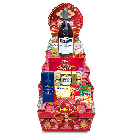 Martell Gordon Bleu 70cl, Ferrero Rocher T16, Delfi Almond Milk Chocolate 180g, Camel Mixed Nuts 80g, Oat Nutrition Chocolate 80g, Deluxe Vegetables Crackers 168g, Prawn Sauce 60g, Tong Garden Potato Snack 40g & Packaging.