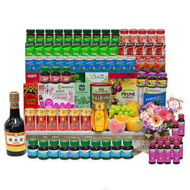 Yomeishu 300ml, New Moon Birdnest with Rock Sugar (6 x 102g), Brands Birdnest with Rock Sugar (5 x 42ml), New Moon Fish Essence (10 x 70ml), Brands Essence of Chicken (10 x 42ml), New Moon Inner Radiance Collagen Drink (10 x 50ml), Berries Essence (3 x 42ml), California Essence of Prunes (3 x 42ml), Langnese Pure Honey 375g, McCoy Green Tea Mint 36g, Sunview Red Seedless Jumbo Size Raisin 425g, Deluxe Biscuit 148g, Fruits, Flowers & Packaging.