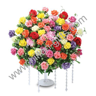 A blend of Artificial roses arrange on the round clear glass in centerpiece shape catch a whiff of beauteous blooms.