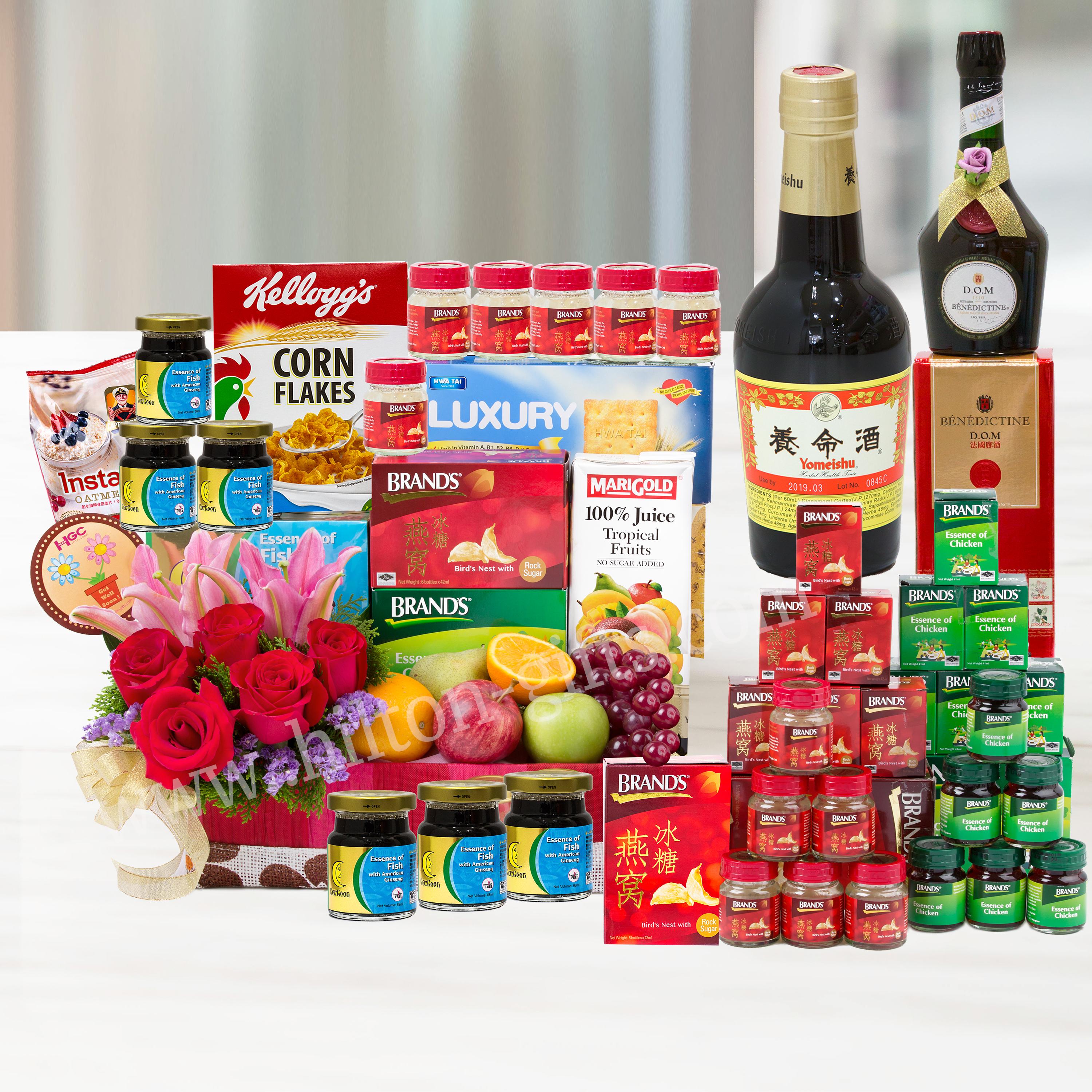 Benedictine Dom (375ml), Yomeishu 300ml, Brands Birdnest with Ginseng, White Fungus, & Rock Sugar (6 x 42ml), New Moon Fish Essence (3 x 70ml), Brands Essence of Chicken (6x42ml), Marigold 100% Apple Juice, Quaker Oatmeal 220g, Luxury Biscuit 148g, Fresh Mixed Fruits, Flowers & Packaging