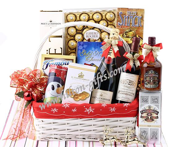 Chivas Regal 12 Year Old Whisky 35cl, Moet & Chandon Brut Imperial Champagne 750ml, Lamartiere French Red Wine 750ml, Ferrero Rocher 300g, Gulliver Coffee Bean Chocolate 120g, Famous Amos Chocolate Chips 168g, Harrodson Danish Butter Cookies 70g, Redondo Chocolate 100g, Fillet Snack 60g.