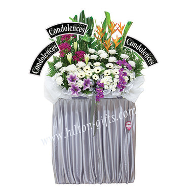Solemn and Peace ,yet pure and meaningful, the comforting shades of this stand from delicate White Gerberas,White Pom Pom, and White Chrysanthemums.With your Condolence expressed on an elegantly lettered sign.It's fitting stand for one worthy of your most regal respects The Box can be customized the colors base on your preference Available color White, Blue ,yellow,purple,green,brown) This Condolence flower stand can be customised the colors base on your preference (Box available colours ,Pink,lavender,yellow,orange,Dark Blue ,Brown ,Gery ) H 2.10m (Premium)