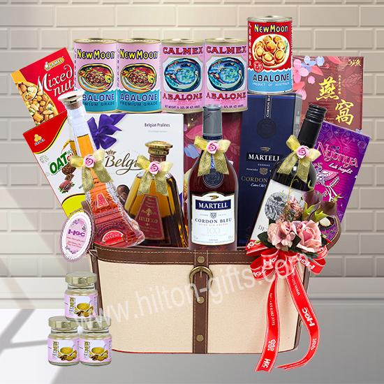 New Moon Australia Abalone 425g $60, Eiffel Tower XO French Brandy 50cl $288, Lully Brandy XO 35cl $238, De Valier Rosso Italian Red Wine 750ml $55, Quality Birdnest with American Ginseng with White Fungus & Rock Sugar (6 x 70ml) $40, Belgium Chocolate 100g $17, Oats Nutrition Chocolate Cereal 80g $8, Camel Mixed Nut 80g $5, Nonya Kuih Bangkit 60g $5. Packaging with Auspicious Decoratives $25. Total Retail Price: $2573 (w/gst $2753.11)