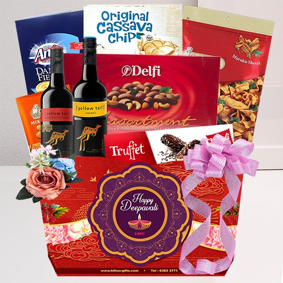 Yellow Tail Australia Shiraz Red Wine (2 x 187ml), Delfi Almond Milk Chocolate 180g, Truffet Swiss Milk Chocolate 100g, Cassava Chip 100g, Murukku Chips 80g, Camel Mixed Nuts 80g, Butter Cookies 135g. Pls Note That The Packaging Can Be Change According to Seasons