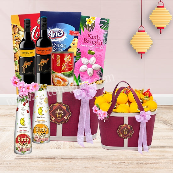 Yellow Tail Australia Shiraz Red Wine (2 x 187ml), Tradition Abalone 425g, New Moon Birdnest Drink (2 x 150ml), Nyonya Kuih Bangkit 60g, Butter Cookies 70g, Camel Mixed Nut 80g, Leather Basket with Mandarin Oranges 8. (H20cm x W14cm x L26cm)