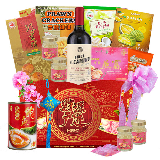 Tradition Abalone 425g, Finca Red Wine 750ml, Birdnest (2 x 70ml), Camel Mixed Nut 80g, Nyonya Kuih Bangkit 60g, Yam Cookies 80g, Durian Cookies 50g, Prawn Crackers 40g.