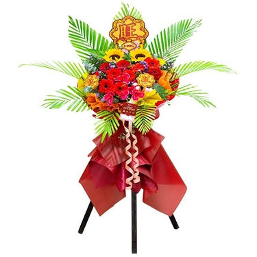 H 170 x 90cm, Reward Your Business Associates Meritorious work By Presenting Him with this Elegant Stand Of Mix Red Gerberas, Sunflowers and Others fillers. This Flower Stand can be customized the shape or colors base on your preference. Color Of Box Stand Blue, Yellow, Pink, Orange and Purple.