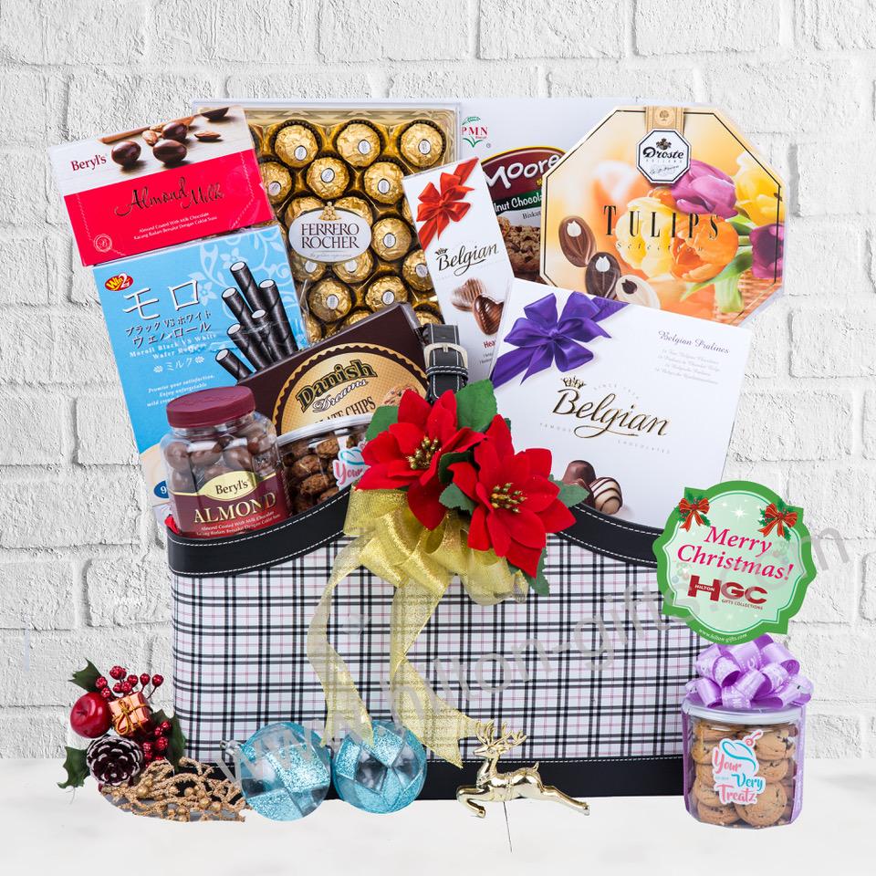Ferrero Rocher 300g, Droste Assortis Tulip Chocolate 200g, Belgian Prelian Chocolate 200g, Belgian Hearts Chocolate 50g, Beryl’s Chocolate 300g, Danish Butter Cookies 150g, Beryl's Strawberry White Chocolate 34g, Moroll Chocolate Wafer Roll’s 90g, Oat Meal Chocolate Chip Cookies 120g, Moore Hazelnut Chocolate Chip Cookies 50g with HGC PVC Leather basket