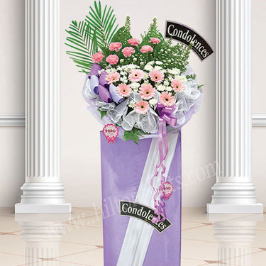 and White Chrysanthemums.With your Condolence expressed on an elegantly lettered sign.It's fitting stand for one worthy of your most regal respects