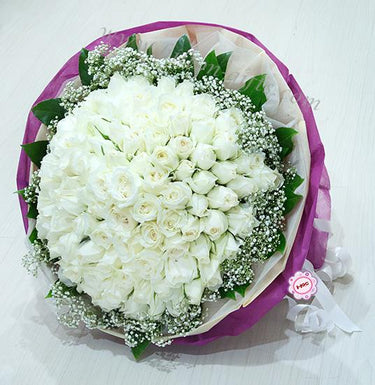 Round Shape 99 stk of white roses surrounded by baby's breath and elegant layers of wrapping ,