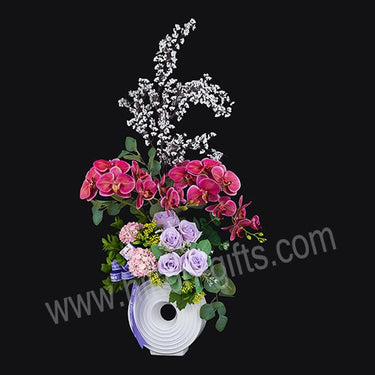 A blend of Artificial Red phalaenopsis ,artificial Purple Roses Flower ,Pink Snow Balls ,Artificial Euphorbia Leaf And yellow rice flower arrangement.