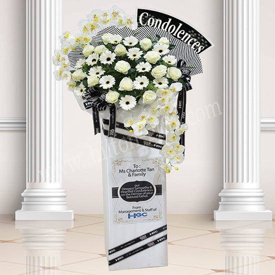 and White Chrysanthemums.With your Condolence expressed on an elegantly lettered sign.It's fitting stand for one worthy of your most regal respects