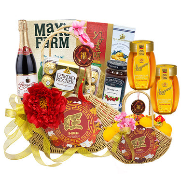 Golden Clear Honey (2 x 375ml), Sparkling Juice 750ml, Ferrero Rocher T16, St Dalfour France Strawberry Fruit Spread 284g, Camel Mixed Nuts 80g, Nyonya Kuih Bangkit 60g, Yam Cookies 80g & comes with a Basket of 8pcs Mandarin Oranges.