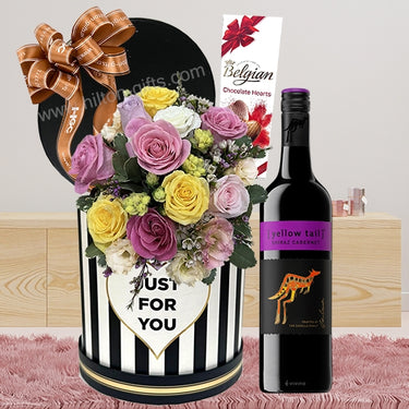 10 Stalk Mixed Colours Roses, Yellow Tail Australia Red Wine 750ml, Belgian Chocolate 60g.