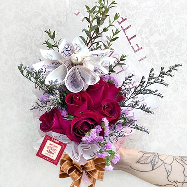 6 Stalk Red Roses with 5pcs $2 Notes, Money Hand Bouquet.