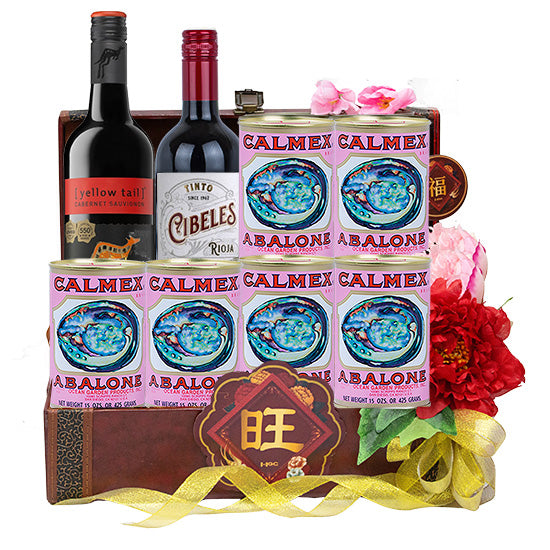 Calmex Abalone (6 x 425g), Yellow Tail Red Wine 750ml, Cibeles Red Wine 750ml & Packaging